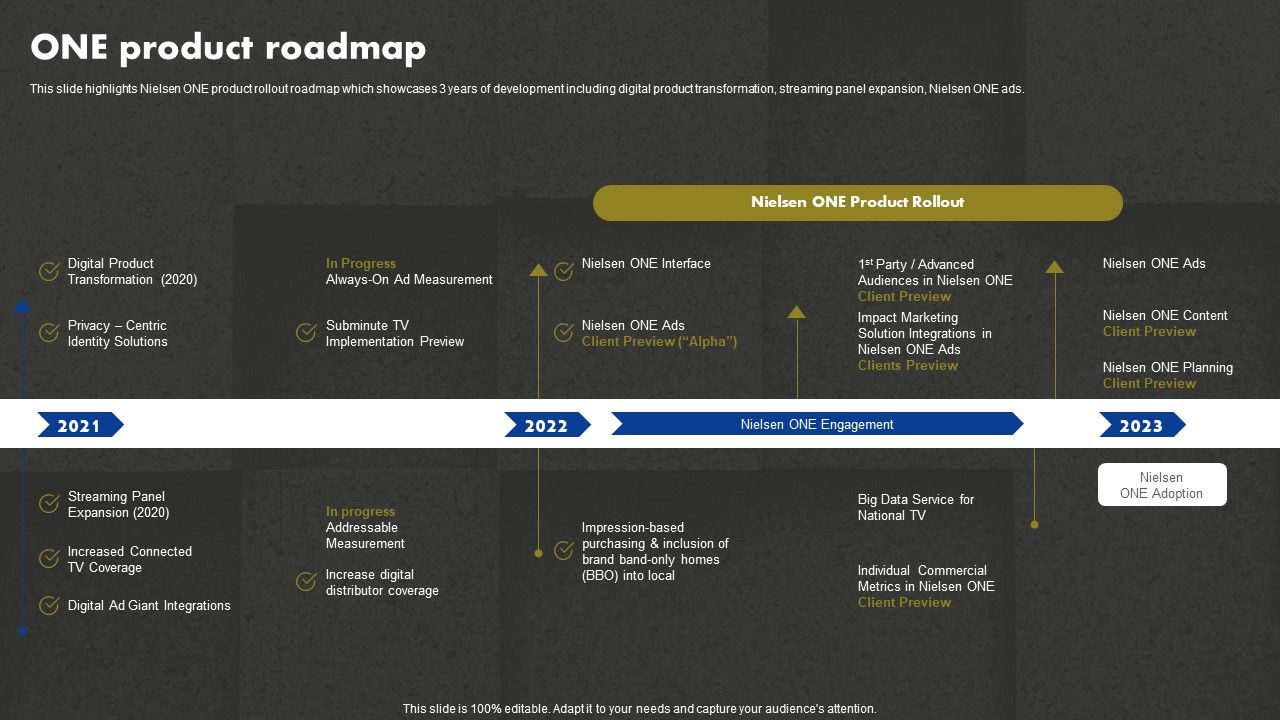 This slide highlights Nielsen ONE product rollout roadmap which showcases 3 years of development including digital product transformation, streaming panel expansion, Nielsen ONE ads. The Data And Customer Analysis Company Outline One Product Roadmap Introduction PDF is a compilation of the most recent design trends as a series of slides. It is suitable for any subject or industry presentation, containing attractive visuals and photo spots for businesses to clearly express their messages. This template contains a variety of slides for the user to input data, such as structures to contrast two elements, bullet points, and slides for written information. Slidegeeks is prepared to create an impression.