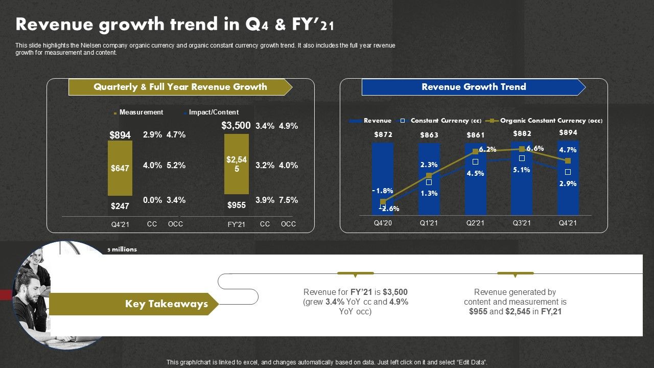 This slide highlights the Nielsen company organic currency and organic constant currency growth trend. It also includes the full year revenue growth for measurement and content. Slidegeeks is one of the best resources for PowerPoint templates. You can download easily and regulate Data And Customer Analysis Company Outline Revenue Growth Trend In Q4 And Fy21 Template PDF for your personal presentations from our wonderful collection. A few clicks is all it takes to discover and get the most relevant and appropriate templates. Use our Templates to add a unique zing and appeal to your presentation and meetings. All the slides are easy to edit and you can use them even for advertisement purposes.
