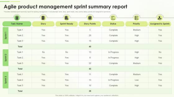 Slidegeeks is one of the best resources for PowerPoint templates. You can download easily and regulate Agile Product Management Sprint Summary Report for your personal presentations from our wonderful collection. A few clicks is all it takes to discover and get the most relevant and appropriate templates. Use our Templates to add a unique zing and appeal to your presentation and meetings. All the slides are easy to edit and you can use them even for advertisement purposes.