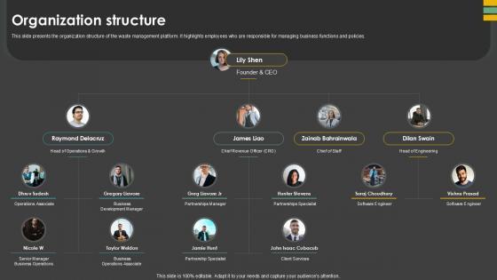 This slide presents the organization structure of the waste management platform. It highlights employees who are responsible for managing business functions and policies. Make sure to capture your audiences attention in your business displays with our gratis customizable Organization Structure Waste Control Platform Pitch Deck Ppt Template. These are great for business strategies, office conferences, capital raising or task suggestions. If you desire to acquire more customers for your tech business and ensure they stay satisfied, create your own sales presentation with these plain slides.
