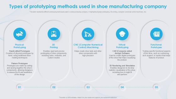 Whether you have daily or monthly meetings, a brilliant presentation is necessary. Types Of Prototyping Methods Used In Shoe Comprehensive Guide can be your best option for delivering a presentation. Represent everything in detail using Types Of Prototyping Methods Used In Shoe Comprehensive Guide and make yourself stand out in meetings. The template is versatile and follows a structure that will cater to your requirements. All the templates prepared by Slidegeeks are easy to download and edit. Our research experts have taken care of the corporate themes as well. So, give it a try and see the results.