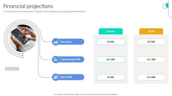 This slide represents financial estimate IT company for 5 years highlighting revenue, operating profit and net profit. Slidegeeks is here to make your presentations a breeze with Financial Projections Function User Interface Service Investor Funding Elevator Pitch Deck With our easy-to-use and customizable templates, you can focus on delivering your ideas rather than worrying about formatting. With a variety of designs to choose from, you are sure to find one that suits your needs. And with animations and unique photos, illustrations, and fonts, you can make your presentation pop. So whether you are giving a sales pitch or presenting to the board, make sure to check out Slidegeeks first