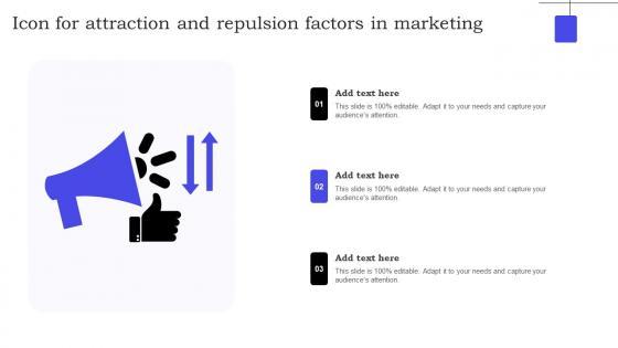 Showcasing this set of slides titled Icon For Attraction And Repulsion Factors In Marketing Mockup Pdf. The topics addressed in these templates are Attraction, Repulsion Factors, Marketing. All the content presented in this PPT design is completely editable. Download it and make adjustments in color, background, font etc. as per your unique business setting.