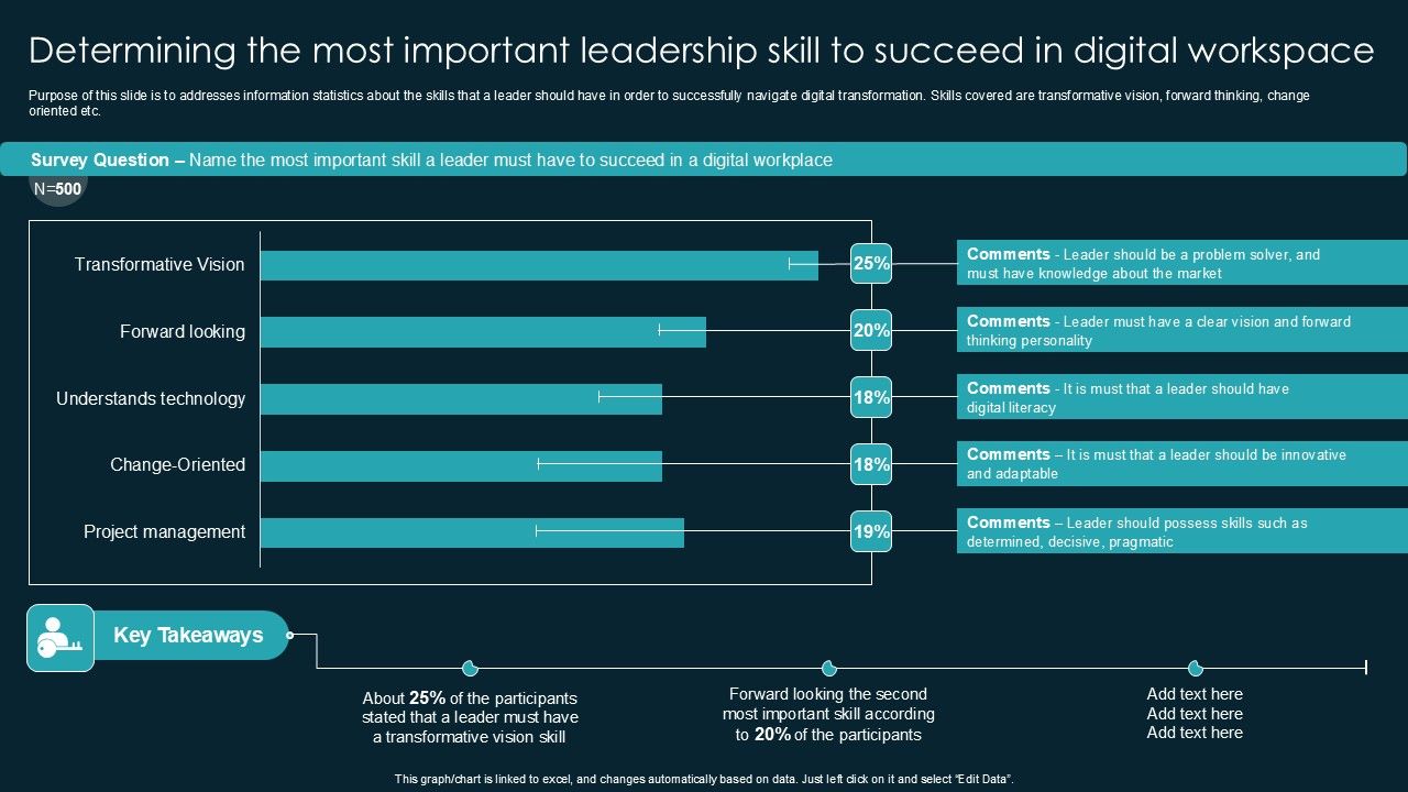 Purpose of this slide is to addresses information statistics about the skills that a leader should have in order to successfully navigate digital transformation. Skills covered are transformative vision, forward thinking, change oriented etc. This Determining The Most Important Leadership Skill To Succeed In Digital Workspace Topics PDF is perfect for any presentation, be it in front of clients or colleagues. It is a versatile and stylish solution for organizing your meetings. The product features a modern design for your presentation meetings. The adjustable and customizable slides provide unlimited possibilities for acing up your presentation. Slidegeeks has done all the homework before launching the product for you. So, do not wait, grab the presentation templates today