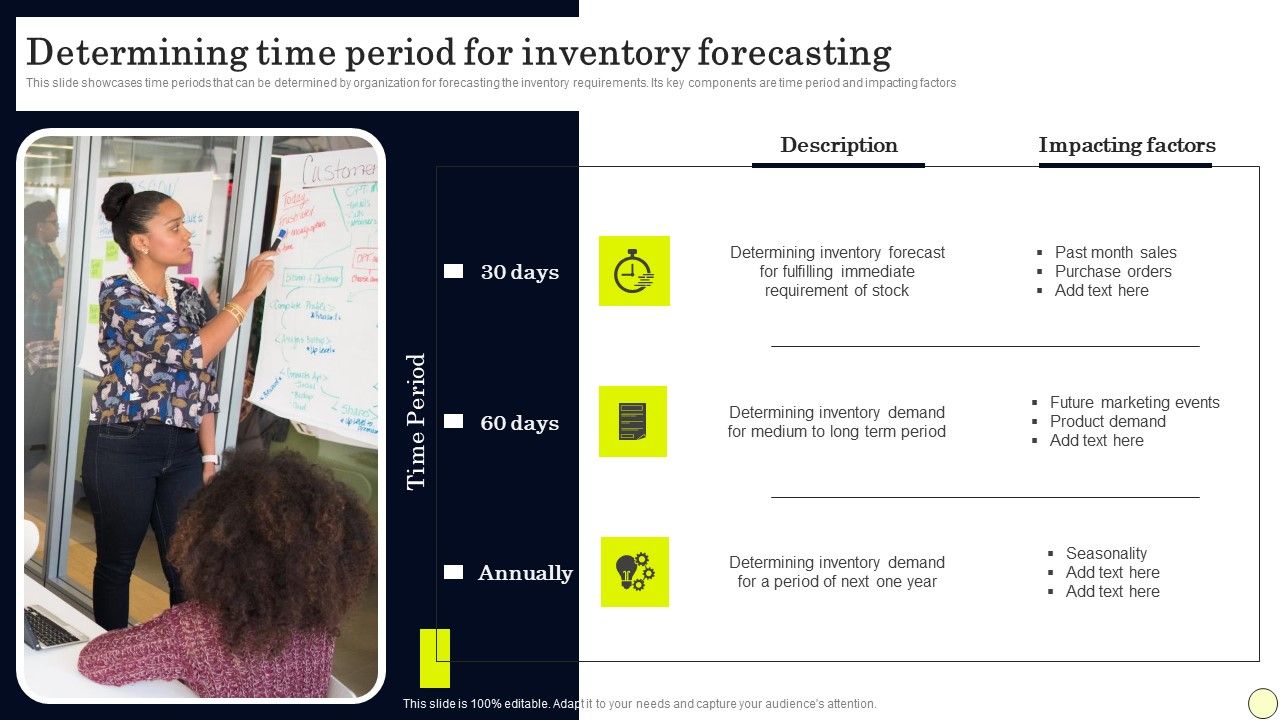 This slide showcases time periods that can be determined by organization for forecasting the inventory requirements. Its key components are time period and impacting factors. Want to ace your presentation in front of a live audience Our Determining Time Period For Inventory Forecasting Introduction PDF can help you do that by engaging all the users towards you. Slidegeeks experts have put their efforts and expertise into creating these impeccable powerpoint presentations so that you can communicate your ideas clearly. Moreover, all the templates are customizable, and easy to edit and downloadable. Use these for both personal and commercial use.