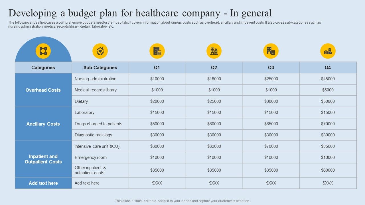 The following slide showcases a comprehensive budget sheet for the hospitals. It covers information about various costs such as overhead, ancillary and impatient costs. It also coves sub-categories such as nursing administration, medical records library, dietary, laboratory etc. This Developing A Budget Plan For Healthcare Company In General Professional PDF is perfect for any presentation, be it in front of clients or colleagues. It is a versatile and stylish solution for organizing your meetings. The Developing A Budget Plan For Healthcare Company In General Professional PDF features a modern design for your presentation meetings. The adjustable and customizable slides provide unlimited possibilities for acing up your presentation. Slidegeeks has done all the homework before launching the product for you. So, do not wait, grab the presentation templates today