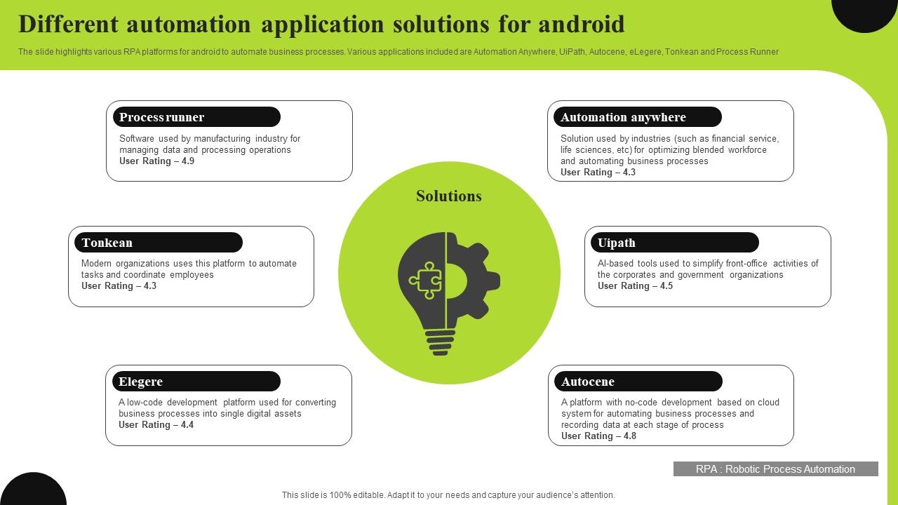 The slide highlights various RPA platforms for android to automate business processes. Various applications included are Automation Anywhere, UiPath, Autocene, eLegere, Tonkean and Process Runner Presenting Different Automation Application Solutions For Android Information PDF to dispense important information. This template comprises six stages. It also presents valuable insights into the topics including Process Runner, Solutions, Automation. This is a completely customizable PowerPoint theme that can be put to use immediately. So, download it and address the topic impactfully.