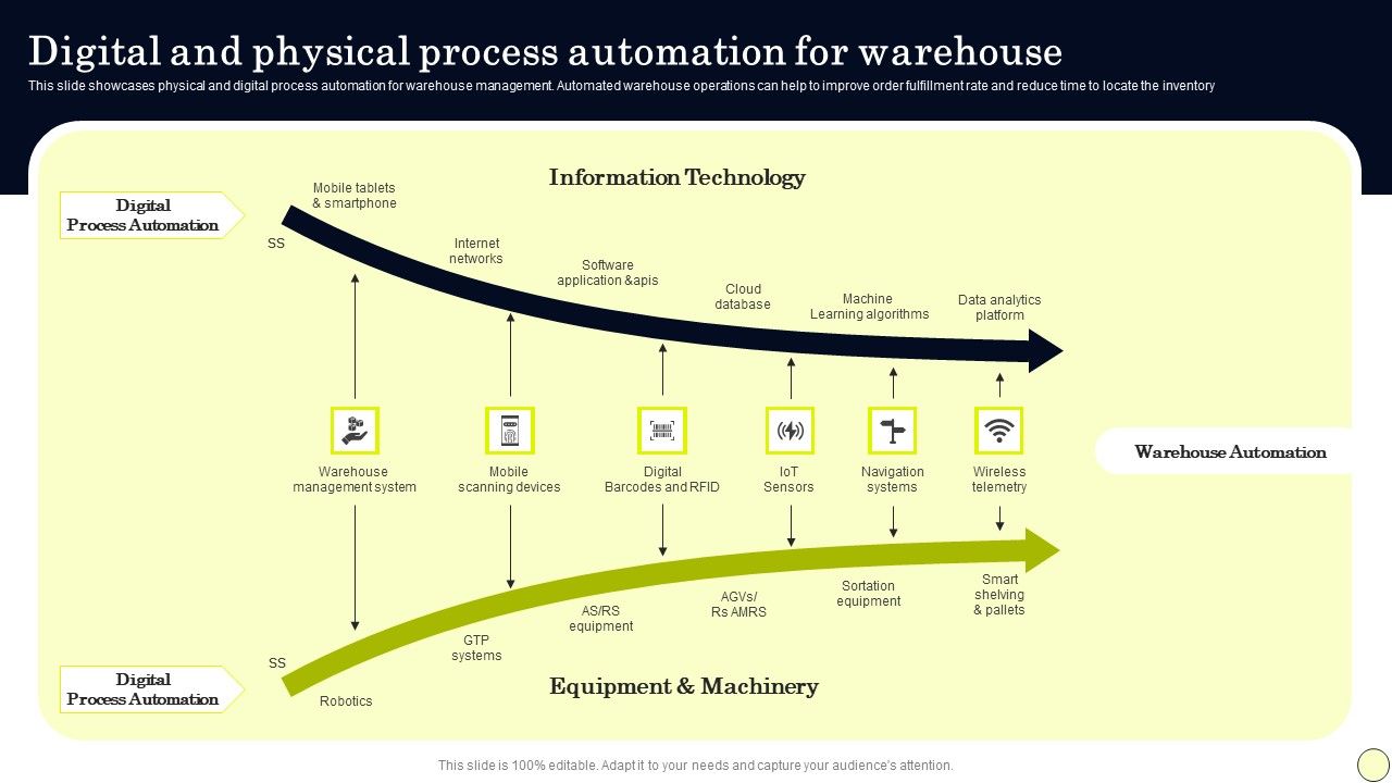 This slide showcases physical and digital process automation for warehouse management. Automated warehouse operations can help to improve order fulfillment rate and reduce time to locate the inventory. Make sure to capture your audiences attention in your business displays with our gratis customizable Digital And Physical Process Automation For Warehouse Sample PDF. These are great for business strategies, office conferences, capital raising or task suggestions. If you desire to acquire more customers for your tech business and ensure they stay satisfied, create your own sales presentation with these plain slides.