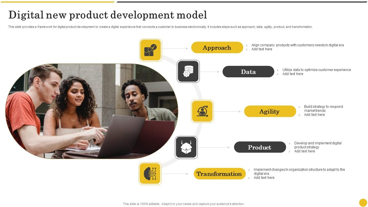 This slide provides a framework for digital product development to create a digital experience that connects a customer to business electronically. It includes steps such as approach, data, agility, product, and transformation. Presenting Digital New Product Development Model Formats PDF to dispense important information. This template comprises five stages. It also presents valuable insights into the topics including Approach, Data, Agility . This is a completely customizable PowerPoint theme that can be put to use immediately. So, download it and address the topic impactfully.
