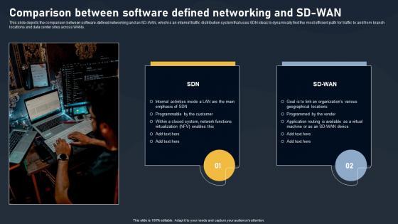 This slide depicts the comparison between software-defined networking and an SD-WAN, which is an internet traffic distribution system that uses SDN ideas to dynamically find the most efficient path for traffic to and from branch locations and data center sites across WANs.The Comparison Between Software Defined Networking SDN Building Blocks Demonstration Pdf is a compilation of the most recent design trends as a series of slides. It is suitable for any subject or industry presentation, containing attractive visuals and photo spots for businesses to clearly express their messages. This template contains a variety of slides for the user to input data, such as structures to contrast two elements, bullet points, and slides for written information. Slidegeeks is prepared to create an impression.