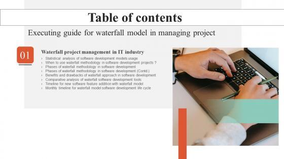 From laying roadmaps to briefing everything in detail, our templates are perfect for you. You can set the stage with your presentation slides. All you have to do is download these easy-to-edit and customizable templates. Executing Guide For Waterfall Model In Managing Project Table Of Contents Infographics Pdf will help you deliver an outstanding performance that everyone would remember and praise you for. Do download this presentation today.