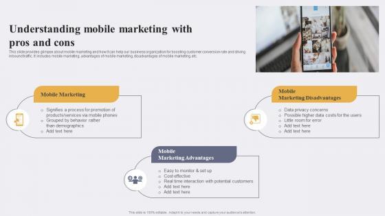 This slide provides glimpse about mobile marketing and how it can help our business organization for boosting customer conversion rate and driving inbound traffic. It includes mobile marketing, advantages of mobile marketing, disadvantages of mobile marketing, etc.Here you can discover an assortment of the finest PowerPoint and Google Slides templates. With these templates, you can create presentations for a variety of purposes while simultaneously providing your audience with an eye-catching visual experience. Download Understanding Mobile Marketing With Pros And Cons Enhancing Conversion Rate By Leveraging Rules Pdf to deliver an impeccable presentation. These templates will make your job of preparing presentations much quicker, yet still, maintain a high level of quality. Slidegeeks has experienced researchers who prepare these templates and write high-quality content for you. Later on, you can personalize the content by editing the Understanding Mobile Marketing With Pros And Cons Enhancing Conversion Rate By Leveraging Rules Pdf.