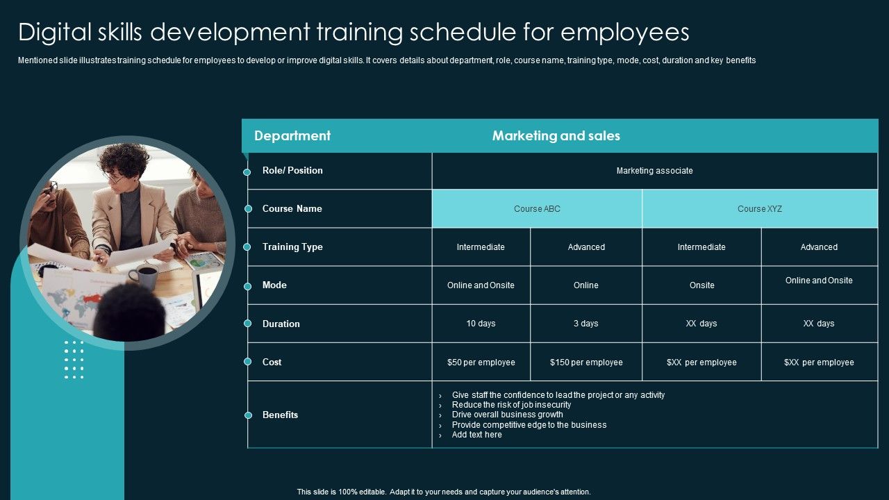 Mentioned slide illustrates training schedule for employees to develop or improve digital skills. It covers details about department, role, course name, training type, mode, cost, duration and key benefits. Do you have to make sure that everyone on your team knows about any specific topic I yes, then you should give Digital Skills Development Training Schedule For Employees Background PDF a try. Our experts have put a lot of knowledge and effort into creating this impeccable Digital Skills Development Training Schedule For Employees Background PDF. You can use this template for your upcoming presentations, as the slides are perfect to represent even the tiniest detail. You can download these templates from the Slidegeeks website and these are easy to edit. So grab these today.