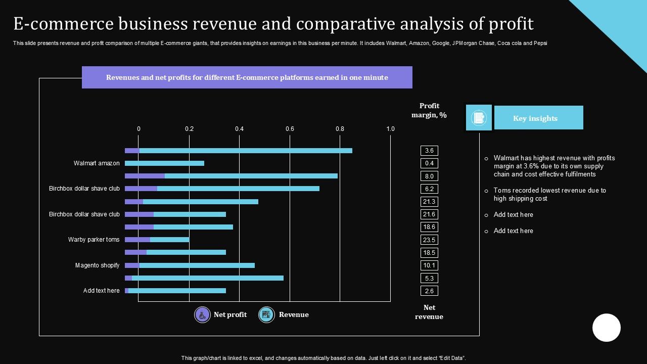 This slide presents revenue and profit comparison of multiple E-commerce giants, that provides insights on earnings in this business per minute. It includes Walmart, Amazon, Google, JPMorgan Chase, Coca cola and Pepsi. Showcasing this set of slides titled E Commerce Business Revenue And Comparative Analysis Of Profit Topics PDF. The topics addressed in these templates are Walmart Highest, Cost Effective Fulfilments, High Shipping Cost. All the content presented in this PPT design is completely editable. Download it and make adjustments in color, background, font etc. as per your unique business setting.