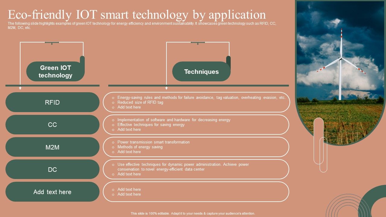 The following slide highlights examples of green IOT technology for energy efficiency and environment sustainability. It showcases green technology such as RFID, CC, M2M, DC, etc. Do you have to make sure that everyone on your team knows about any specific topic I yes, then you should give Eco Friendly IOT Smart Technology By Application Introduction PDF a try. Our experts have put a lot of knowledge and effort into creating this impeccable Eco Friendly IOT Smart Technology By Application Introduction PDF. You can use this template for your upcoming presentations, as the slides are perfect to represent even the tiniest detail. You can download these templates from the Slidegeeks website and these are easy to edit. So grab these today