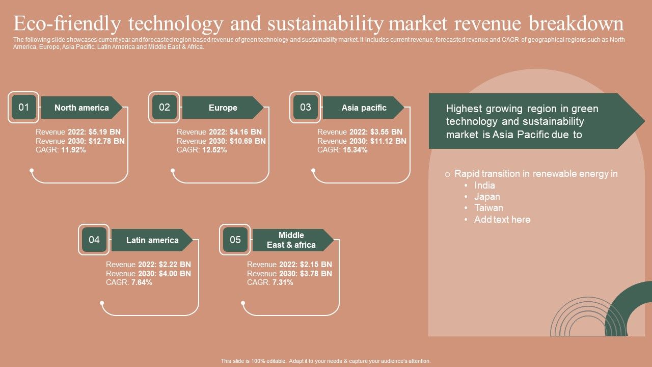 The following slide showcases current year and forecasted region based revenue of green technology and sustainability market. It includes current revenue, forecasted revenue and CAGR of geographical regions such as North America, Europe, Asia Pacific, Latin America and Middle East and Africa. Slidegeeks is here to make your presentations a breeze with Eco Friendly Technology And Sustainability Market Revenue Breakdown Portrait PDF With our easy-to-use and customizable templates, you can focus on delivering your ideas rather than worrying about formatting. With a variety of designs to choose from, you are sure to find one that suits your needs. And with animations and unique photos, illustrations, and fonts, you can make your presentation pop. So whether you are giving a sales pitch or presenting to the board, make sure to check out Slidegeeks first