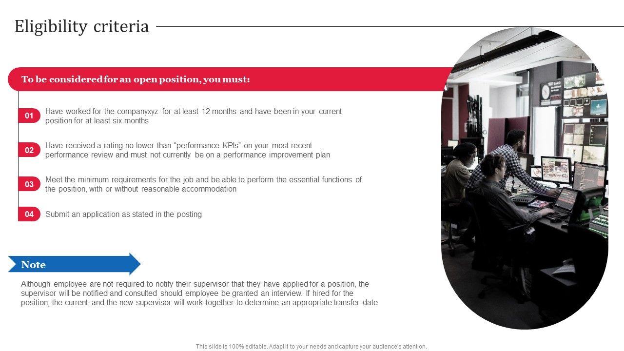 Welcome to our selection of the Eligibility Criteria Strategic Guide On Talent Recruitment Formats PDF. These are designed to help you showcase your creativity and bring your sphere to life. Planning and Innovation are essential for any business that is just starting out. This collection contains the designs that you need for your everyday presentations. All of our PowerPoints are 100 percent editable, so you can customize them to suit your needs. This multi-purpose template can be used in various situations. Grab these presentation templates today