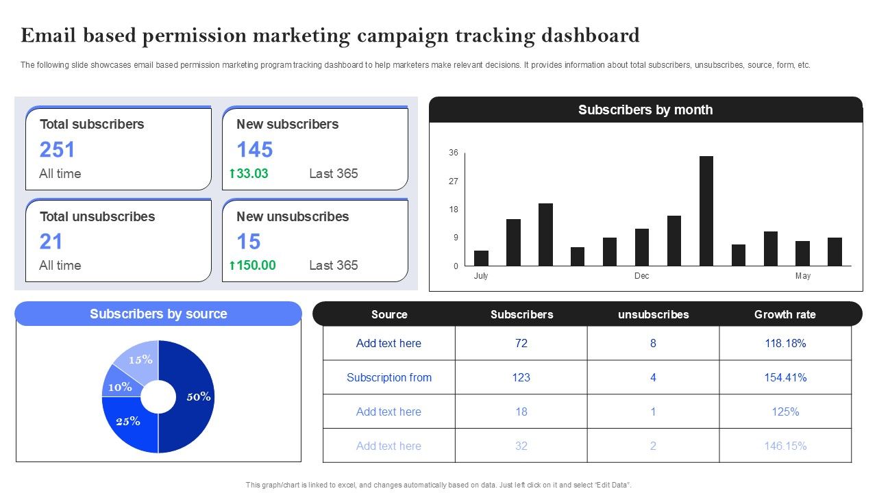 The following slide showcases email based permission marketing program tracking dashboard to help marketers make relevant decisions. It provides information about total subscribers, unsubscribes, source, form, etc. Do you have to make sure that everyone on your team knows about any specific topic I yes, then you should give Email Based Permission Marketing Campaign Tracking Dashboard Portrait PDF a try. Our experts have put a lot of knowledge and effort into creating this impeccable Email Based Permission Marketing Campaign Tracking Dashboard Portrait PDF. You can use this template for your upcoming presentations, as the slides are perfect to represent even the tiniest detail. You can download these templates from the Slidegeeks website and these are easy to edit. So grab these today.