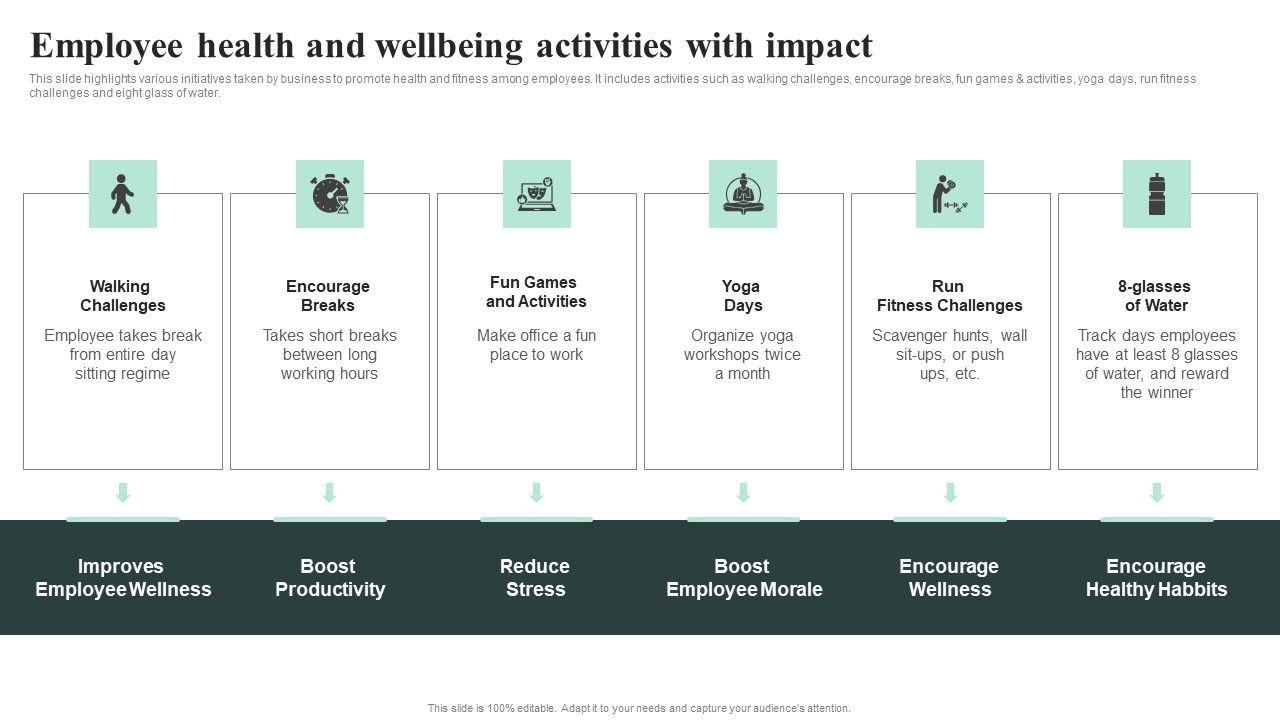 This slide highlights various initiatives taken by business to promote health and fitness among employees. It includes activities such as walking challenges, encourage breaks, fun games and activities, yoga days, run fitness challenges and eight glass of water. Make sure to capture your audiences attention in your business displays with our gratis customizable Employee Health And Wellbeing Activities With Impact Topics PDF. These are great for business strategies, office conferences, capital raising or task suggestions. If you desire to acquire more customers for your tech business and ensure they stay satisfied, create your own sales presentation with these plain slides.