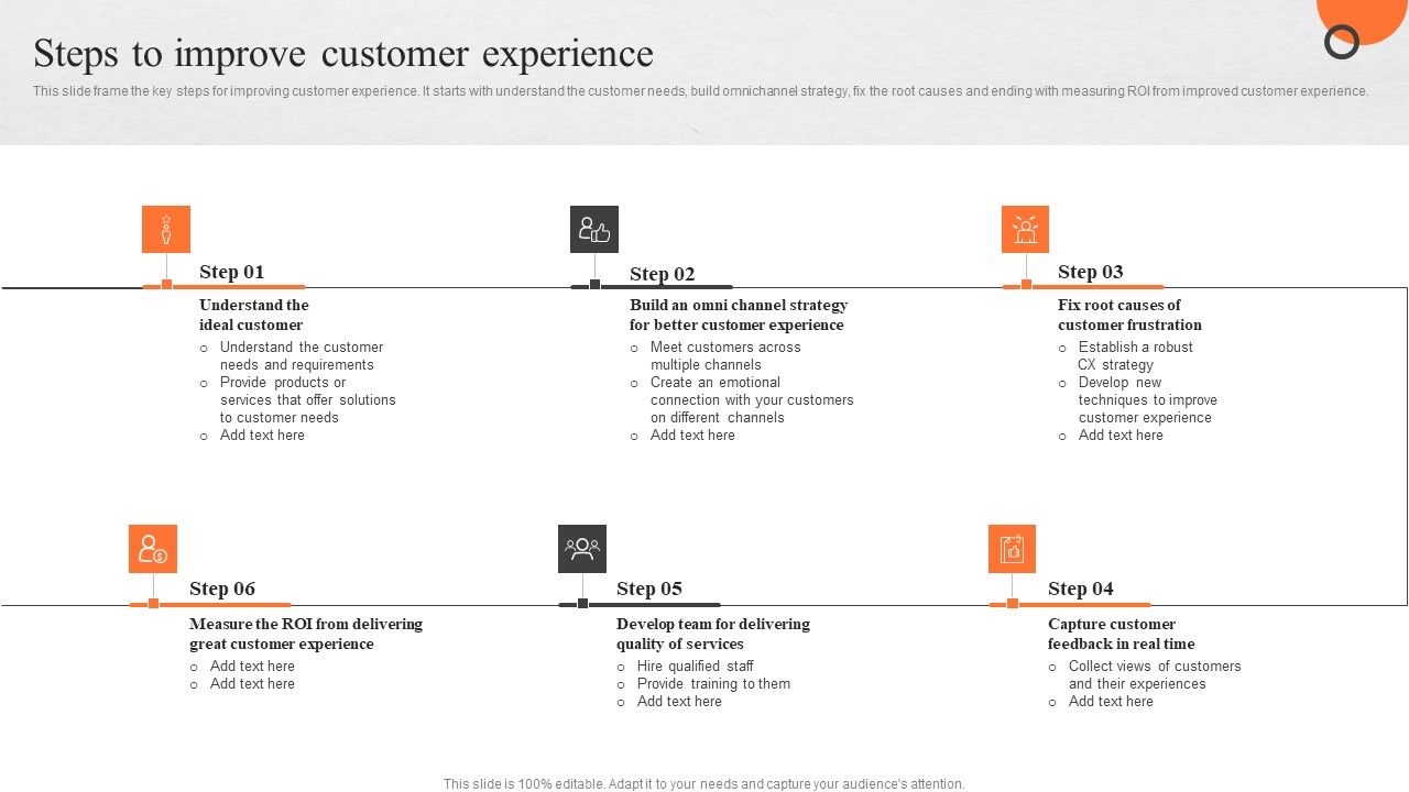 This slide frame the key steps for improving customer experience. It starts with understand the customer needs, build omnichannel strategy, fix the root causes and ending with measuring ROI from improved customer experience. Slidegeeks is here to make your presentations a breeze with Enhancing Buyer Journey Steps To Improve Customer Experience Elements PDF With our easy to use and customizable templates, you can focus on delivering your ideas rather than worrying about formatting. With a variety of designs to choose from, you are sure to find one that suits your needs. And with animations and unique photos, illustrations, and fonts, you can make your presentation pop. So whether you are giving a sales pitch or presenting to the board, make sure to check out Slidegeeks first.