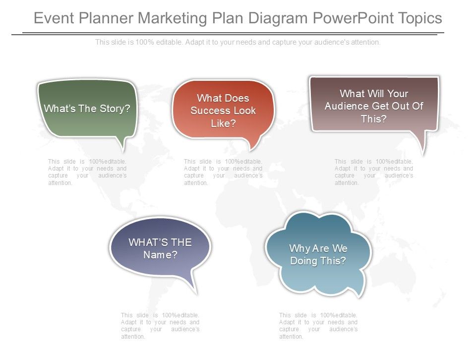 This is a event planner marketing plan diagram powerpoint topics. This is a five stage process. The stages in this process are whats the story, what does success look like, what will your audience get out of this, what?s the name, why are we doing this.