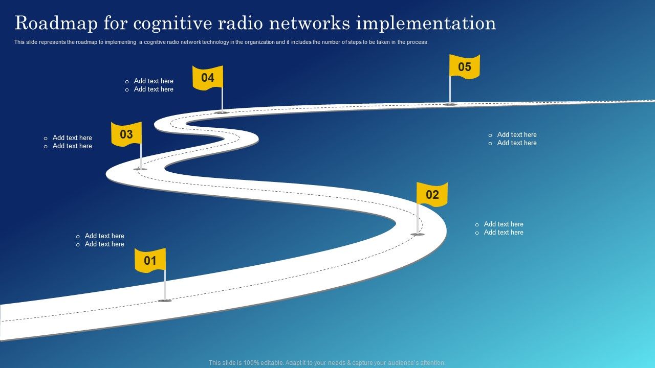 This slide represents the roadmap to implementing a cognitive radio network technology in the organization and it includes the number of steps to be taken in the process. Do you have to make sure that everyone on your team knows about any specific topic I yes, then you should give Cognitive Sensing Innovation Roadmap For Cognitive Radio Networks Implementation Themes PDF a try. Our experts have put a lot of knowledge and effort into creating this impeccable Cognitive Sensing Innovation Roadmap For Cognitive Radio Networks Implementation Themes PDF. You can use this template for your upcoming presentations, as the slides are perfect to represent even the tiniest detail. You can download these templates from the Slidegeeks website and these are easy to edit. So grab these today