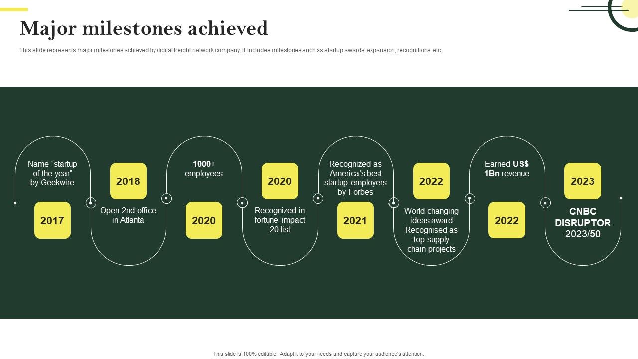This slide represents major milestones achieved by digital freight network company. It includes milestones such as startup awards, expansion, recognitions, etc. Present like a pro with Major Milestones Achieved Logistic Company Investor Fund Raising Pitch Deck Summary PDF Create beautiful presentations together with your team, using our easy-to-use presentation slides. Share your ideas in real-time and make changes on the fly by downloading our templates. So whether you are in the office, on the go, or in a remote location, you can stay in sync with your team and present your ideas with confidence. With Slidegeeks presentation got a whole lot easier. Grab these presentations today.
