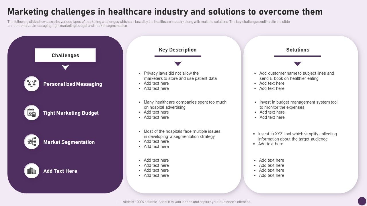 The following slide showcases the various types of marketing challenges which are faced by the healthcare industry along with multiple solutions. The key challenges outlined in the slide are personalized messaging, tight marketing budget and market segmentation. Find a pre designed and impeccable Guide To Healthcare Services Administration Marketing Challenges In Healthcare Industry And Solutions Microsoft PDF. The templates can ace your presentation without additional effort. You can download these easy to edit presentation templates to make your presentation stand out from others. So, what are you waiting for Download the template from Slidegeeks today and give a unique touch to your presentation.