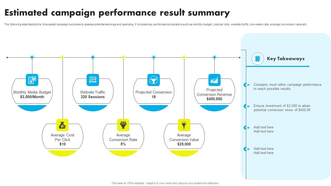 The following slide depicts the forecasted campaign outcomes to assess potential earnings and spending. It includes key performance indicators such as monthly budget, cost per click, website traffic, conversion rate, average conversion value etc. Coming up with a presentation necessitates that the majority of the effort goes into the content and the message you intend to convey. The visuals of a PowerPoint presentation can only be effective if it supplements and supports the story that is being told. Keeping this in mind our experts created Estimated Campaign Performance Result Summary Ppt Slide PDF to reduce the time that goes into designing the presentation. This way, you can concentrate on the message while our designers take care of providing you with the right template for the situation.