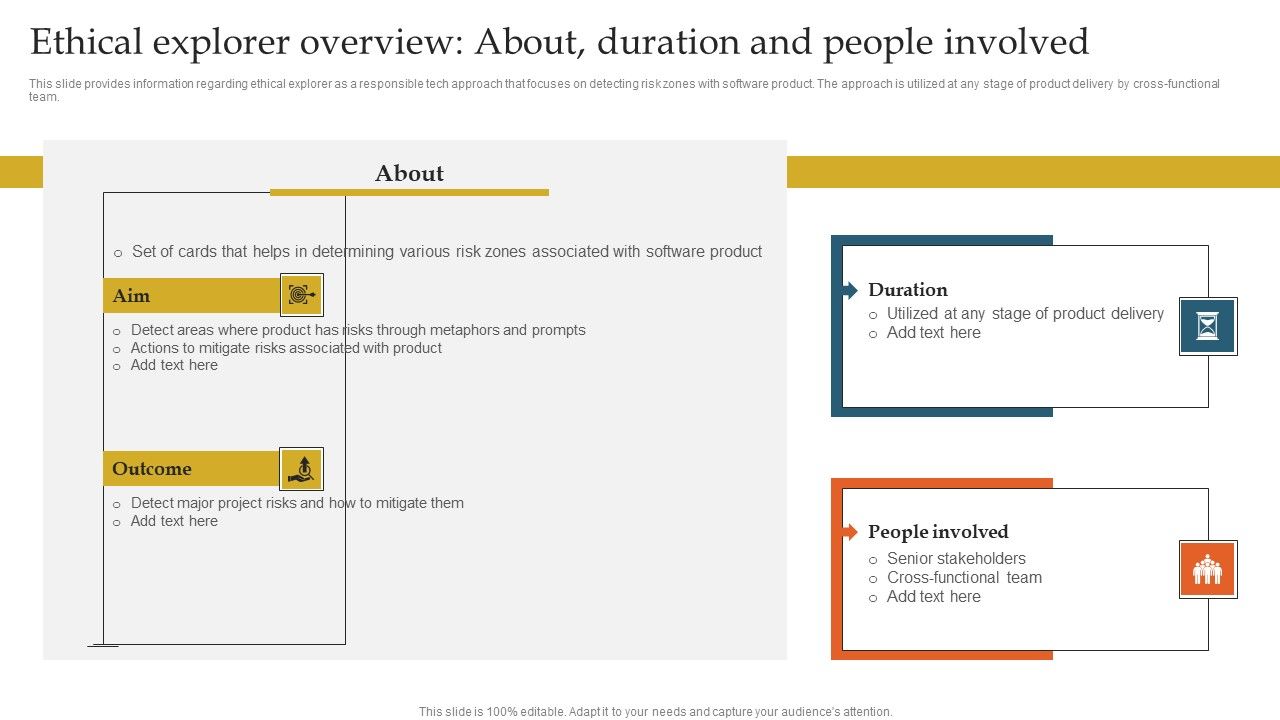 This slide provides information regarding ethical explorer as a responsible tech approach that focuses on detecting risk zones with software product. The approach is utilized at any stage of product delivery by cross-functional team. Do you have an important presentation coming up Are you looking for something that will make your presentation stand out from the rest Look no further than Ethical Explorer Overview About Duration And People Involved Ppt Layouts Example Topics PDF. With our professional designs, you can trust that your presentation will pop and make delivering it a smooth process. And with Slidegeeks, you can trust that your presentation will be unique and memorable. So why wait Grab Ethical Explorer Overview About Duration And People Involved Ppt Layouts Example Topics PDF today and make your presentation stand out from the rest.