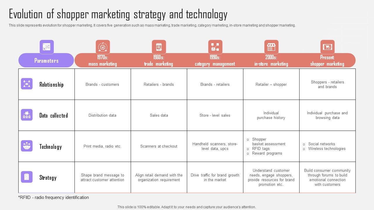This slide represents evolution for shopper marketing. It covers five generation such as mass marketing, trade marketing, category marketing, in-store marketing and shopper marketing. There are so many reasons you need a Evolution Of Shopper Marketing Strategy Technology Optimizing Customer Purchase Experience By Executing Portrait PDF. The first reason is you can not spend time making everything from scratch, Thus, Slidegeeks has made presentation templates for you too. You can easily download these templates from our website easily.