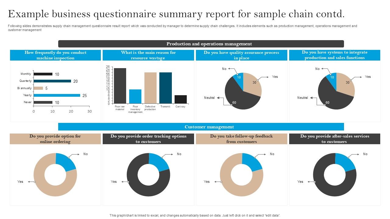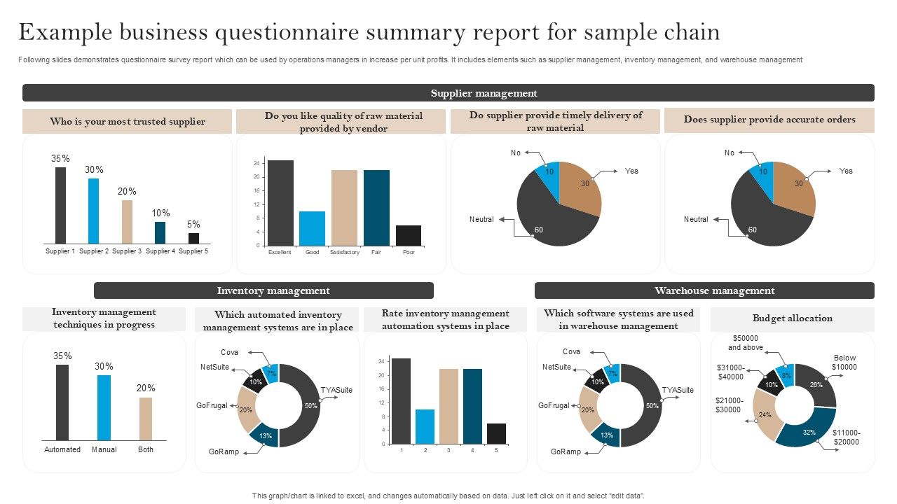 Following slides demonstrates questionnaire survey report which can be used by operations managers in increase per unit profits. It includes elements such as supplier management, inventory management, and warehouse management. Showcasing this set of slides titled Example Business Questionnaire Summary Report For Sample Chain Survey SS. The topics addressed in these templates are Inventory Management, Warehouse Management, Budget Allocation. All the content presented in this PPT design is completely editable. Download it and make adjustments in color, background, font etc. as per your unique business setting.