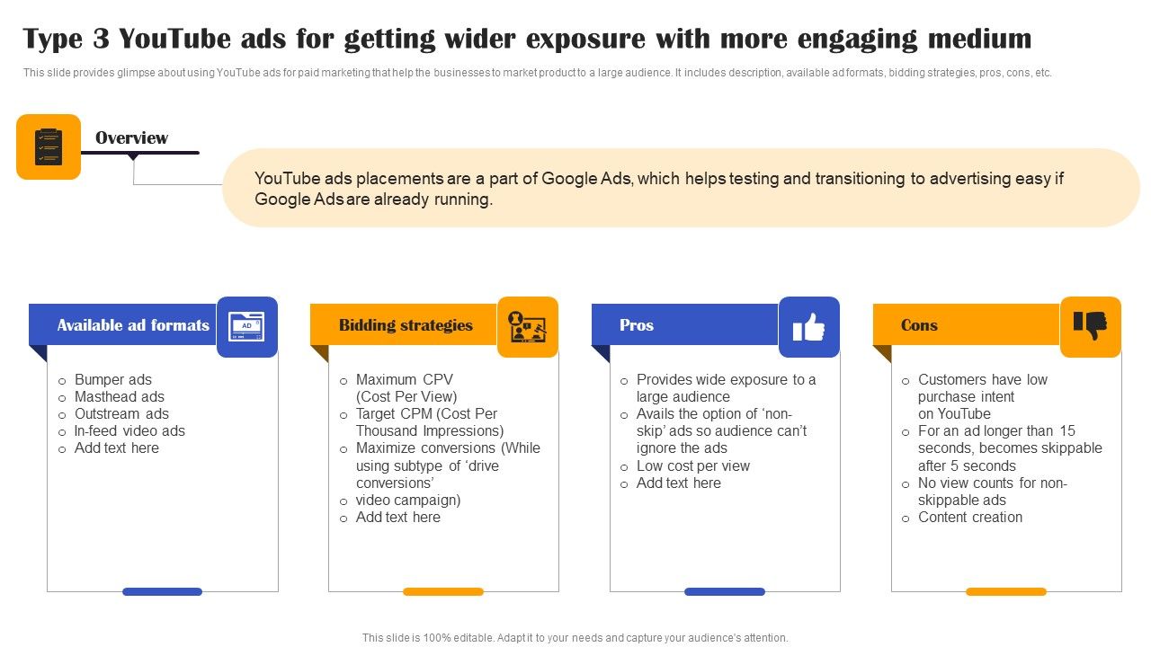 Execution Of Effective Paid Media Advertising Strategies Type 3 Youtube Ads For Getting Wider Exposure Inspiration PDF