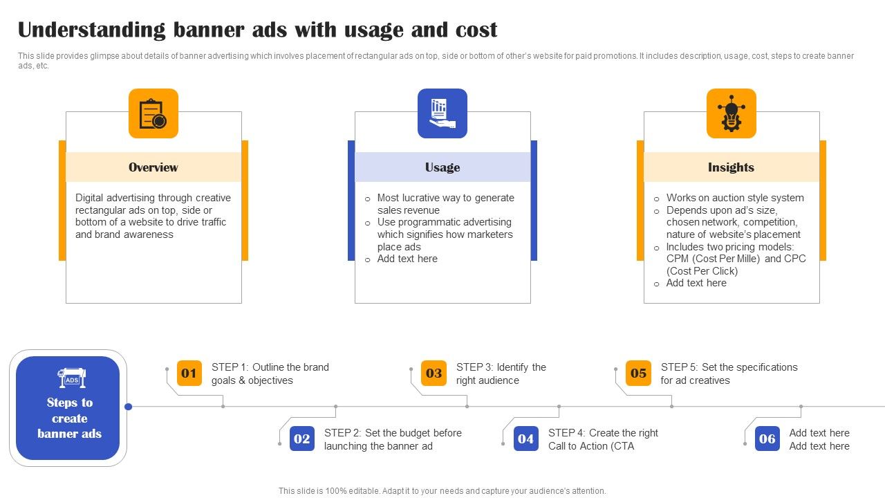 This slide provides glimpse about details of banner advertising which involves placement of rectangular ads on top, side or bottom of others website for paid promotions. It includes description, usage, cost, steps to create banner ads, etc. Do you have an important presentation coming up Are you looking for something that will make your presentation stand out from the rest Look no further than Execution Of Effective Paid Media Advertising Strategies Understanding Banner Ads With Usage And Cost Slides PDF. With our professional designs, you can trust that your presentation will pop and make delivering it a smooth process. And with Slidegeeks, you can trust that your presentation will be unique and memorable. So why wait Grab Execution Of Effective Paid Media Advertising Strategies Understanding Banner Ads With Usage And Cost Slides PDF today and make your presentation stand out from the rest.