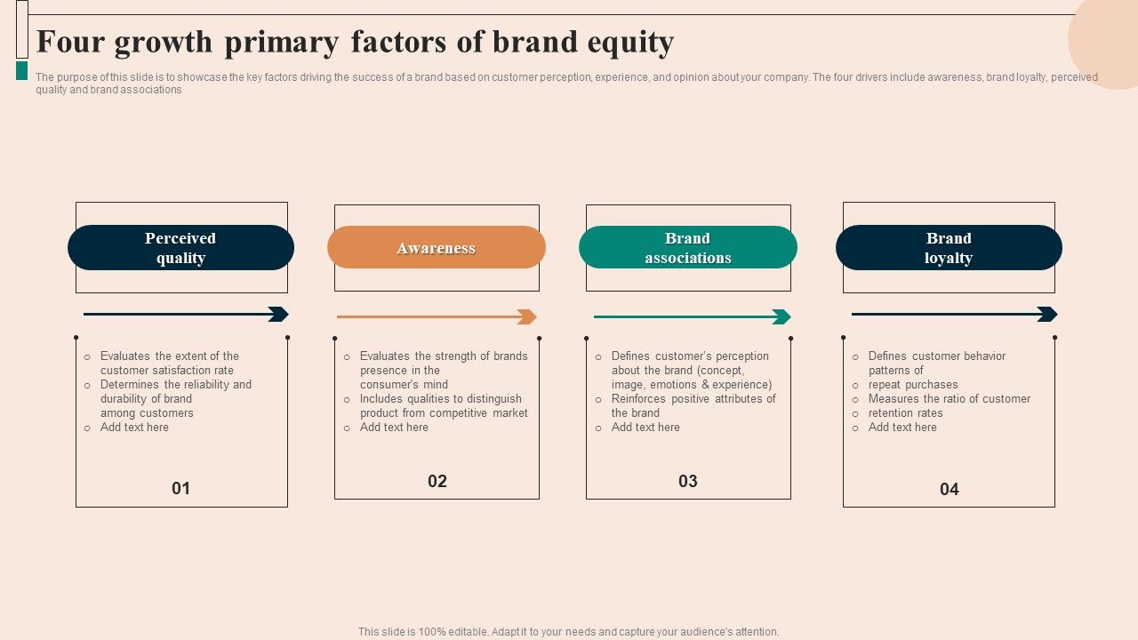 The purpose of this slide is to showcase the key factors driving the success of a brand based on customer perception, experience, and opinion about your company. The four drivers include awareness, brand loyalty, perceived quality and brand associations Presenting Four Growth Primary Factors Of Brand Equity Infographics PDF to dispense important information. This template comprises four stages. It also presents valuable insights into the topics including Perceived Quality, Awareness, Brand Associations. This is a completely customizable PowerPoint theme that can be put to use immediately. So, download it and address the topic impactfully.