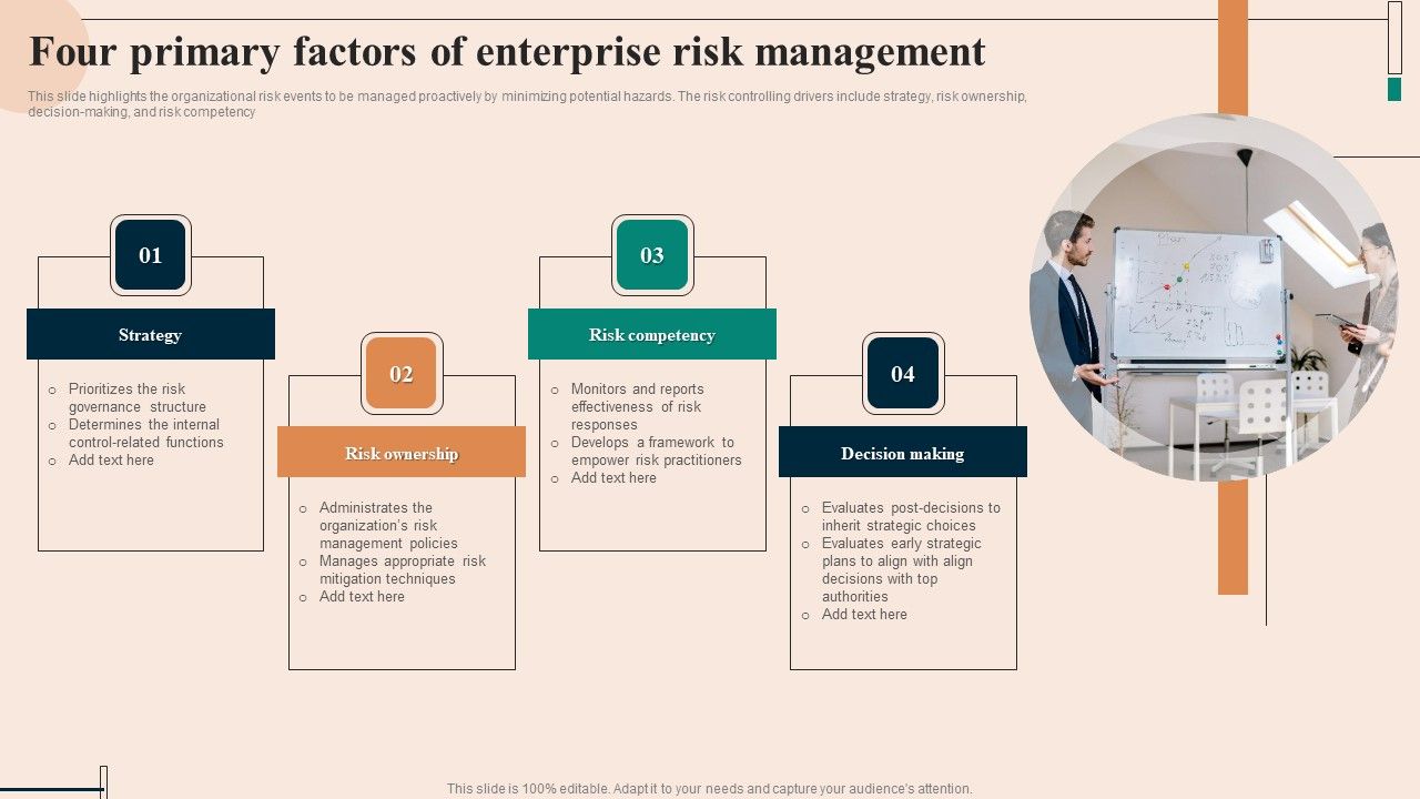 This slide highlights the organizational risk events to be managed proactively by minimizing potential hazards. The risk controlling drivers include strategy, risk ownership, decision making, and risk competency Persuade your audience using this Four Primary Factors Of Enterprise Risk Management Graphics PDF. This PPT design covers four stages, thus making it a great tool to use. It also caters to a variety of topics including Strategy, Risk Ownership, Risk Competency . Download this PPT design now to present a convincing pitch that not only emphasizes the topic but also showcases your presentation skills.