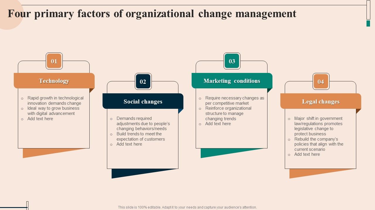 Presenting Four Primary Factors Of Organizational Change Management Professional PDF to dispense important information. This template comprises four stages. It also presents valuable insights into the topics including Technology, Social Changes, Marketing Conditions. This is a completely customizable PowerPoint theme that can be put to use immediately. So, download it and address the topic impactfully.
