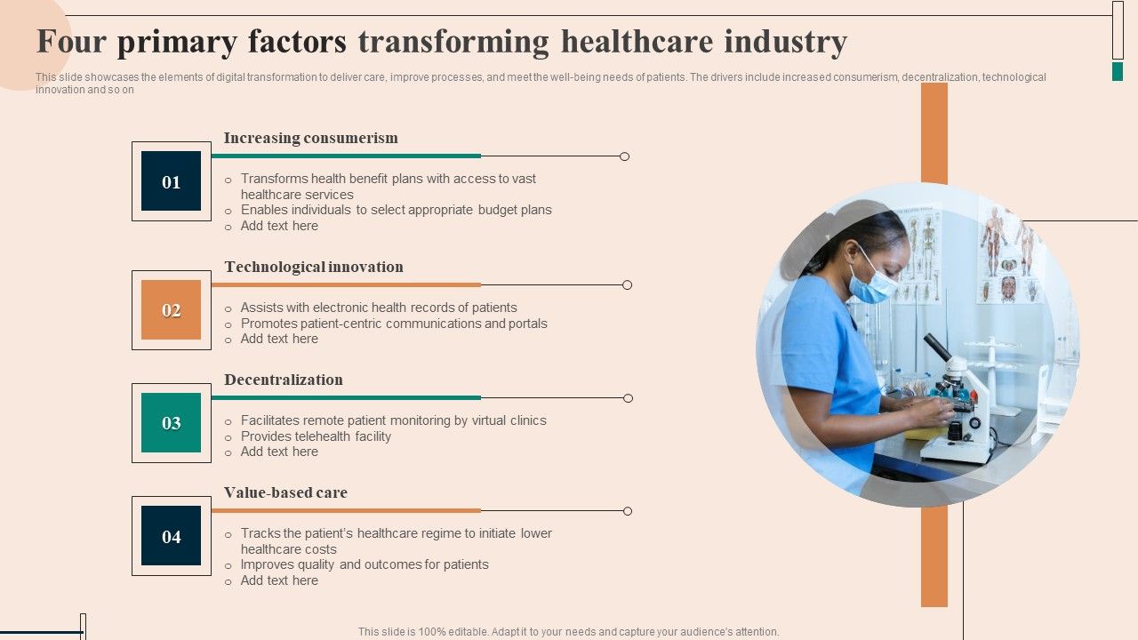 This slide showcases the elements of digital transformation to deliver care, improve processes, and meet the well-being needs of patients. The drivers include increased consumerism, decentralization, technological innovation and so on Persuade your audience using this Four Primary Factors Transforming Healthcare Industry Information PDF. This PPT design covers four stages, thus making it a great tool to use. It also caters to a variety of topics including Increasing Consumerism, Technological Innovation, Decentralization. Download this PPT design now to present a convincing pitch that not only emphasizes the topic but also showcases your presentation skills.