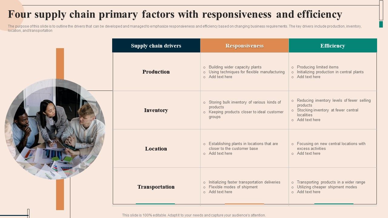 The purpose of this slide is to outline the drivers that can be developed and managed to emphasize responsiveness and efficiency based on changing business requirements. The key drivers include production, inventory, location, and transportation Presenting Four Supply Chain Primary Factors With Responsiveness And Efficiency Summary PDF to dispense important information. This template comprises one stages. It also presents valuable insights into the topics including Factors, Supply Chain, Efficiency. This is a completely customizable PowerPoint theme that can be put to use immediately. So, download it and address the topic impactfully.
