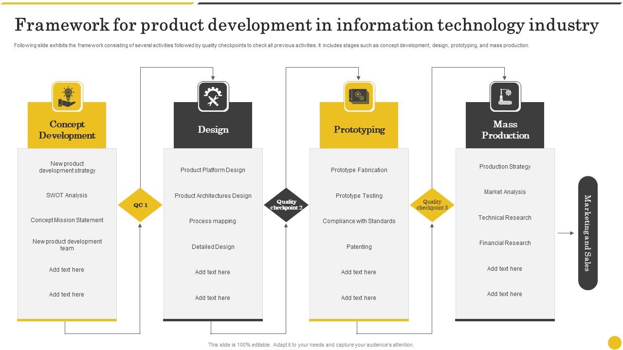 Following slide exhibits the framework consisting of several activities followed by quality checkpoints to check all previous activities. It includes stages such as concept development, design, prototyping, and mass production. Presenting Framework For Product Development In Information Technology Industry Pictures PDF to dispense important information. This template comprises four stages. It also presents valuable insights into the topics including Concept Development, Design, Prototyping . This is a completely customizable PowerPoint theme that can be put to use immediately. So, download it and address the topic impactfully.