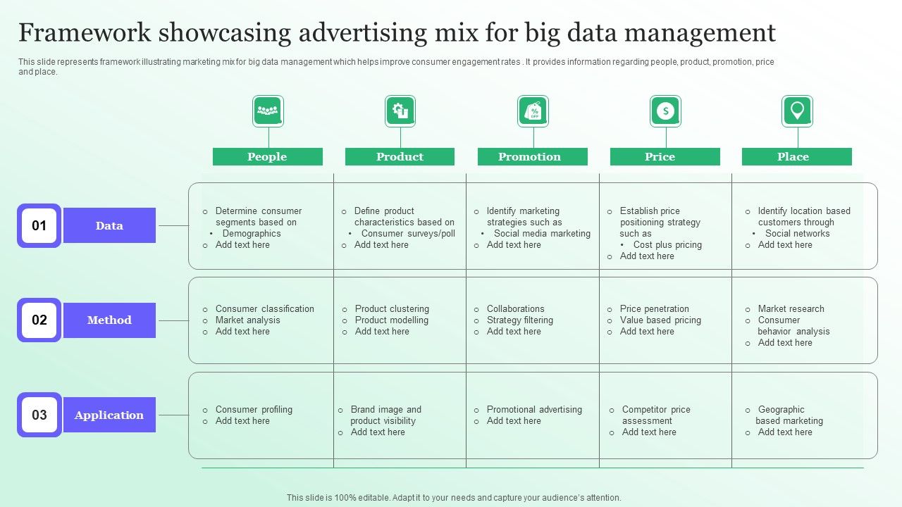 This slide represents framework illustrating marketing mix for big data management which helps improve consumer engagement rates . It provides information regarding people, product, promotion, price and place. Pitch your topic with ease and precision using this Framework Showcasing Advertising Mix For Big Data Management Microsoft PDF. This layout presents information on People, Product, Promotion, Price, Place. It is also available for immediate download and adjustment. So, changes can be made in the color, design, graphics or any other component to create a unique layout.