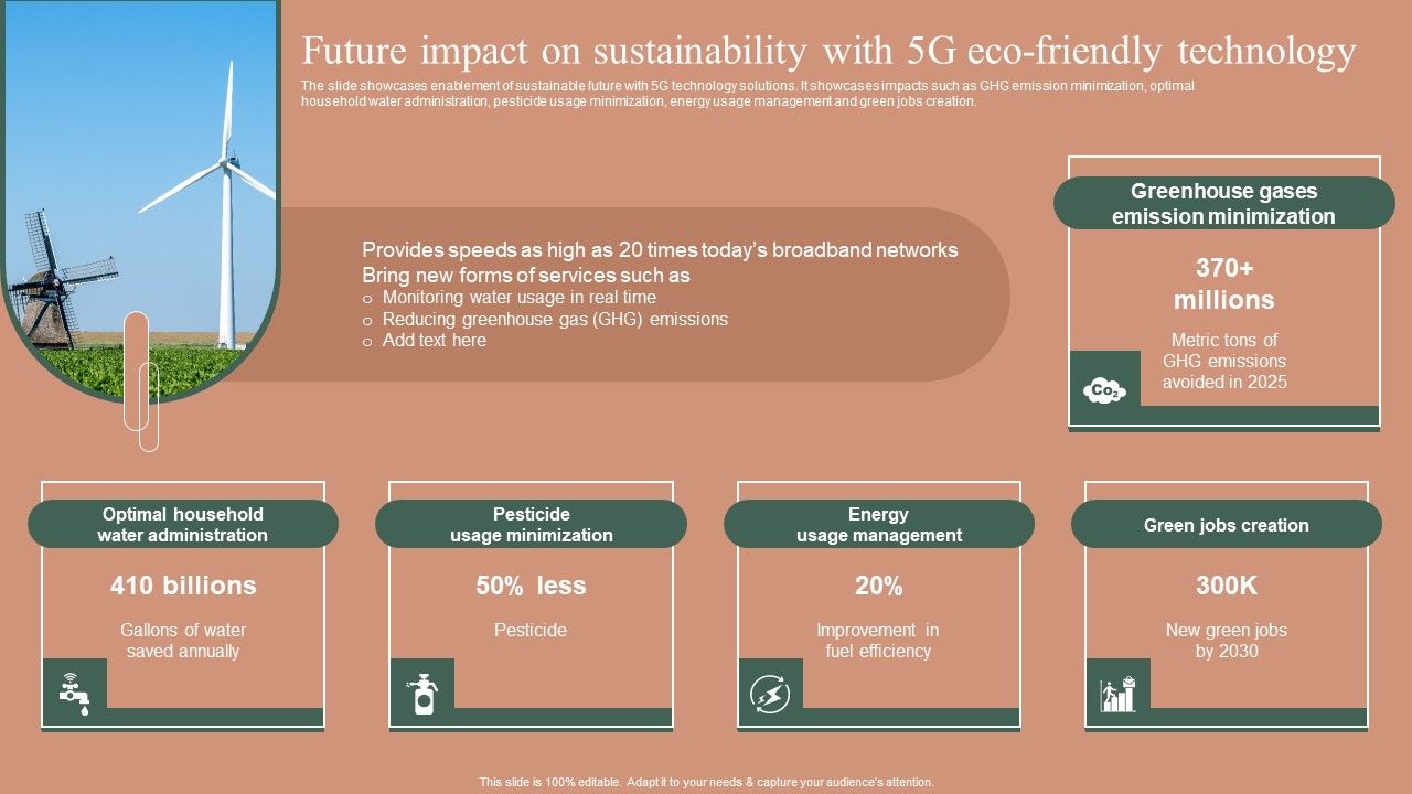 The slide showcases enablement of sustainable future with 5G technology solutions. It showcases impacts such as GHG emission minimization, optimal household water administration, pesticide usage minimization, energy usage management and green jobs creation. If your project calls for a presentation, then Slidegeeks is your go-to partner because we have professionally designed, easy-to-edit templates that are perfect for any presentation. After downloading, you can easily edit Future Impact On Sustainability With 5G Eco Friendly Technology Background PDF and make the changes accordingly. You can rearrange slides or fill them with different images. Check out all the handy templates