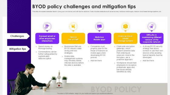 If your project calls for a presentation, then Slidegeeks is your go-to partner because we have professionally designed, easy-to-edit templates that are perfect for any presentation. After downloading, you can easily edit BYOD Policy Challenges And Mitigation Tips and make the changes accordingly. You can rearrange slides or fill them with different images. Check out all the handy templates