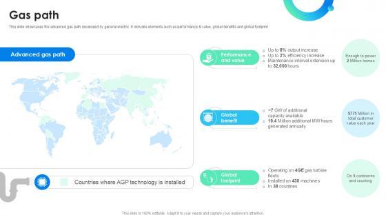 This slide showcases the advanced gas path developed by general electric. It includes elements such as performance and value, global benefits and global footprint. Make sure to capture your audiences attention in your business displays with our gratis customizable Gas Path Global Energy Company Profile PPT Template CP SS V. These are great for business strategies, office conferences, capital raising or task suggestions. If you desire to acquire more customers for your tech business and ensure they stay satisfied, create your own sales presentation with these plain slides.