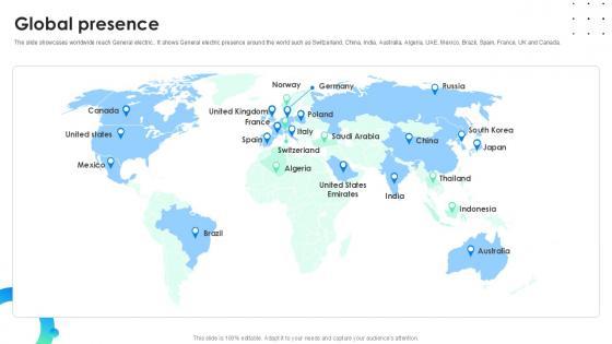 The slide showcases worldwide reach General electric.. It shows General electric presence around the world such as Switzerland, China, India, Australia, Algeria, UAE, Mexico, Brazil, Spain, France, UK and Canada. Formulating a presentation can take up a lot of effort and time, so the content and message should always be the primary focus. The visuals of the PowerPoint can enhance the presenters message, so our Global Presence Global Energy Company Profile PPT Template CP SS V was created to help save time. Instead of worrying about the design, the presenter can concentrate on the message while our designers work on creating the ideal templates for whatever situation is needed. Slidegeeks has experts for everything from amazing designs to valuable content, we have put everything into Global Presence Global Energy Company Profile PPT Template CP SS V