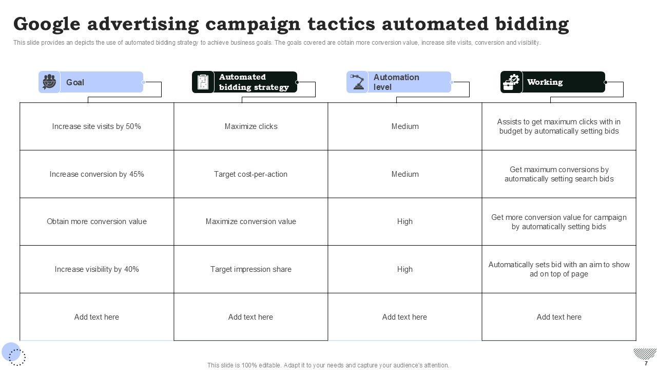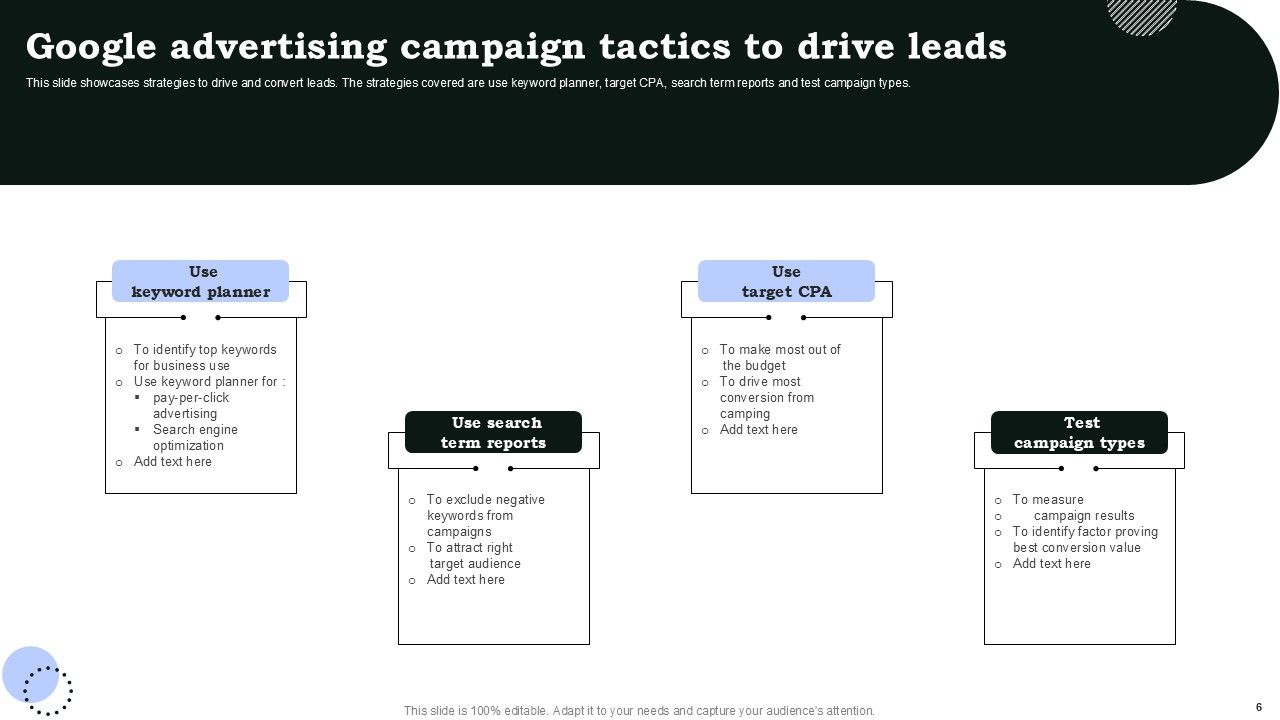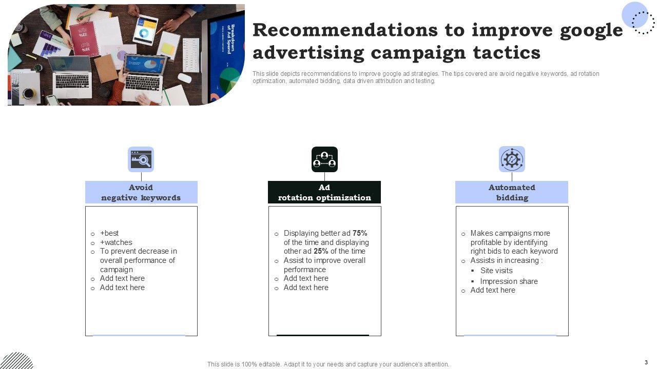 Boost your confidence and team morale with this well-structured Google Advertising Campaign Tactics Ppt PowerPoint Presentation Complete Deck With Slides. This prefabricated set gives a voice to your presentation because of its well-researched content and graphics. Our experts have added all the components very carefully, thus helping you deliver great presentations with a single click. Not only that, it contains a set of twelve slides that are designed using the right visuals, graphics, etc. Various topics can be discussed, and effective brainstorming sessions can be conducted using the wide variety of slides added in this complete deck. Apart from this, our PPT design contains clear instructions to help you restructure your presentations and create multiple variations. The color, format, design anything can be modified as deemed fit by the user. Not only this, it is available for immediate download. So, grab it now.