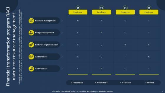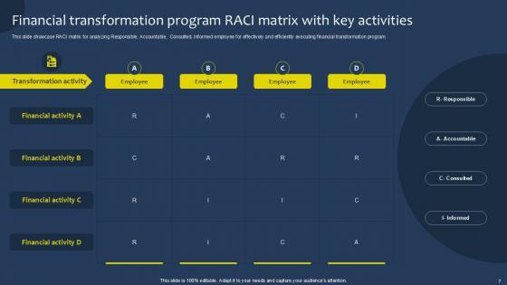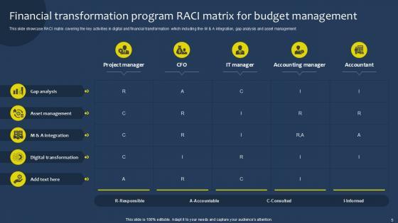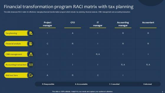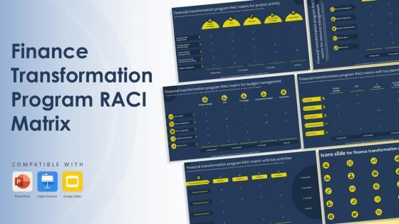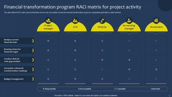 This presentation deck enables you to communicate the message, idea, and proposal to your audience in a clear and effective manner. The slides of this PowerPoint Bundle are professional and visually appealing, engaging your audience and gaining their heartful interest in your content. In addition to its spectacular design, this PPT deck is easy to use and altered to fit the specific needs of the user. All Accounting And Financial Transformation Framework,Digital Transformation For Accounting And Finance,Key Deliverable Of Financial Transformation,Strategic Financial Transformation Toolkit,Financial Operations Acceleration Toolkit slides in this set are compatible with multiple data handling and presentation platforms like Google Slides, MS Excel, Tableau, etc., so you can present your information hassle-free. Begin your journey to tremendous success using our Finance Transformation Program RACI Matrix Powerpoint Ppt Template in many settings, including meetings, pitches, and conference presentations In fact, customer testimonials.