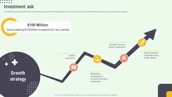 The following slide depicts information about the funding requirement for digital pharmacy. It includes information about the total funds required and several growth strategies. Presenting this PowerPoint presentation, titled Investment Ask Digital Pharmacy Company Investor Funding Ppt Slide, with topics curated by our researchers after extensive research. This editable presentation is available for immediate download and provides attractive features when used. Download now and captivate your audience. Presenting this Investment Ask Digital Pharmacy Company Investor Funding Ppt Slide. Our researchers have carefully researched and created these slides with all aspects taken into consideration. This is a completely customizable Investment Ask Digital Pharmacy Company Investor Funding Ppt Slide that is available for immediate downloading. Download now and make an impact on your audience. Highlight the attractive features available with our PPTs.
