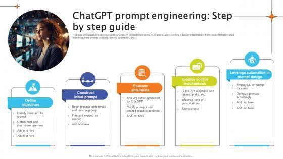 This slide showcases step by step guide for ChatGPT prompt engineering, referable by users working in backend technology. It provides information about objectives, initial prompt, evaluate, control, automation, etc. Get a simple yet stunning designed ChatGPT Prompt Engineering Step By Step Guide Crafting Interactions A Guide AI SS V. It is the best one to establish the tone in your meetings. It is an excellent way to make your presentations highly effective. So, download this PPT today from Slidegeeks and see the positive impacts. Our easy-to-edit ChatGPT Prompt Engineering Step By Step Guide Crafting Interactions A Guide AI SS V can be your go-to option for all upcoming conferences and meetings. So, what are you waiting for Grab this template today.