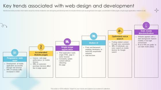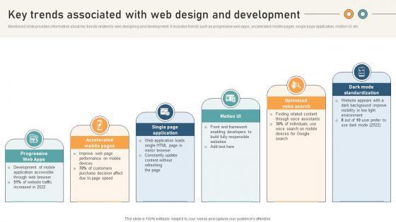 Mentioned slide provides information about key trends related to web designing and development. It includes trends such as progressive web apps, accelerated mobile pages, single page application, motion UI, etc. Want to ace your presentation in front of a live audience Our Comprehensive Guide For Website Key Trends Associated With Web Design And Development can help you do that by engaging all the users towards you. Slidegeeks experts have put their efforts and expertise into creating these impeccable powerpoint presentations so that you can communicate your ideas clearly. Moreover, all the templates are customizable, and easy-to-edit and downloadable. Use these for both personal and commercial use.